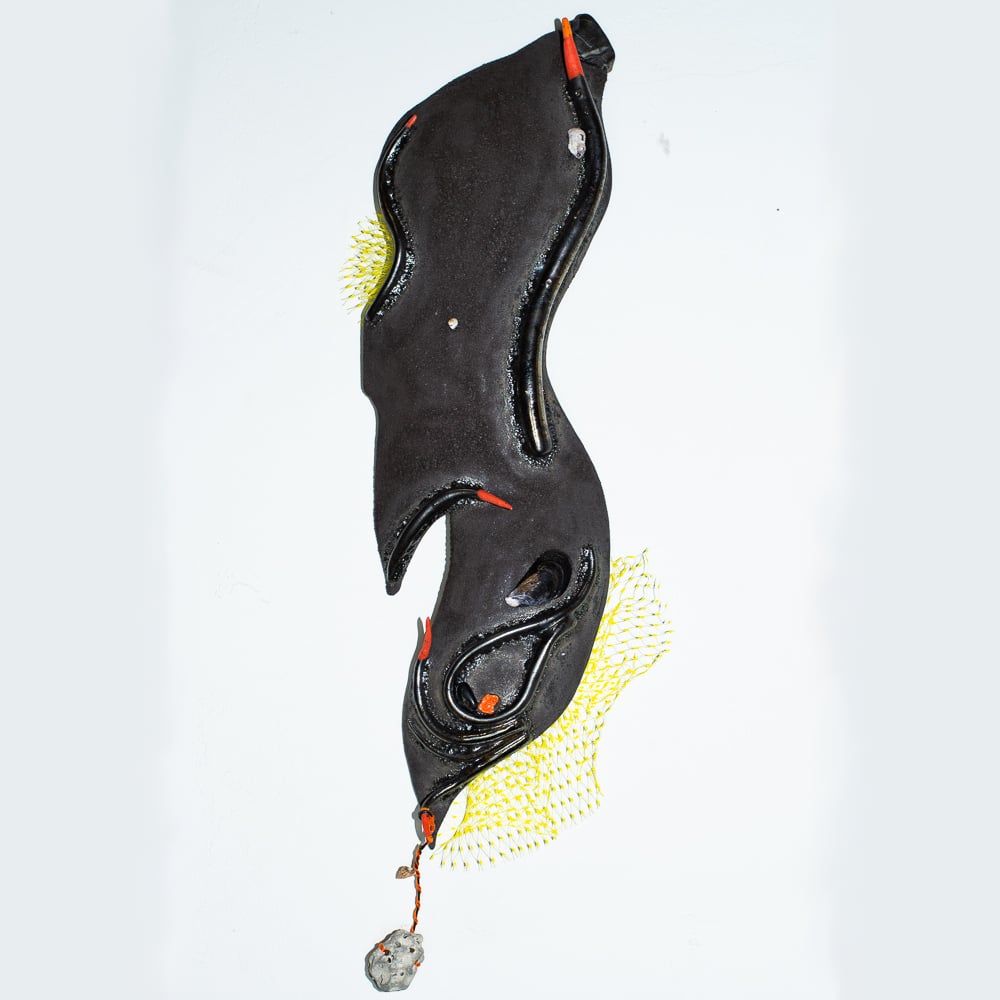 glazed stoneware, rocks, embroidery floss, aluminum, shells, barnacle, plastic netting